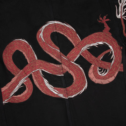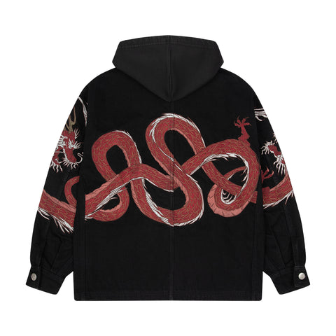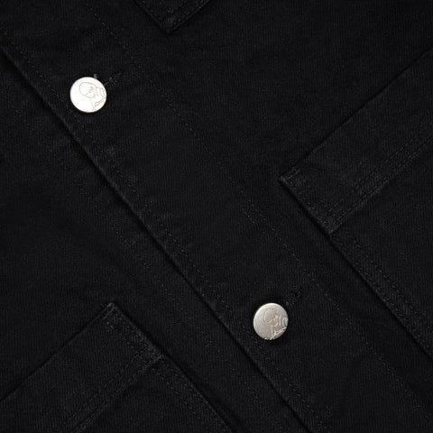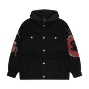 14oz denim / 460gsm brushed cotton hood / 100% cotton / embroidery on back and sleeves / pockets on front / custom buttons / fits true to size