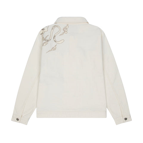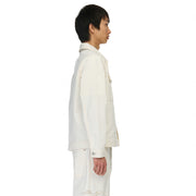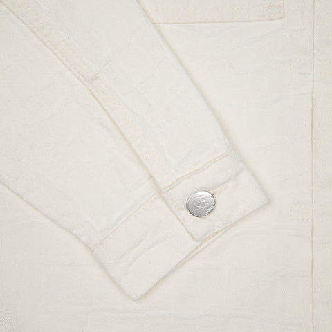 13oz jacquard patterned denim / 100% cotton / embroidery on front and back / custom buttons / fits true to size