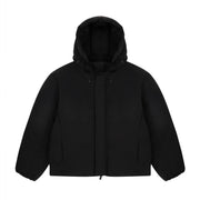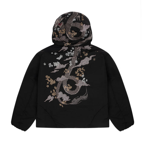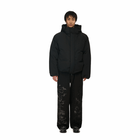 117gsm parachute fabric / duck down filling / 100% nylon / wind- and waterproof / polyester lining / embroidery on back and hood / with JKJ zipper and velcro / fits true to size