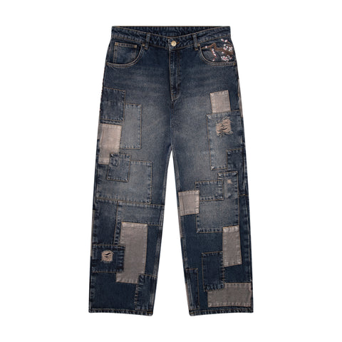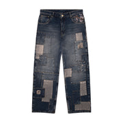 14,5oz denim / 100% cotton / 20+ hand sewn patches all over / embroidery on front pocket and back / embroidered leather patch / washed effect / distressed patches / wash inside out / fits true to size