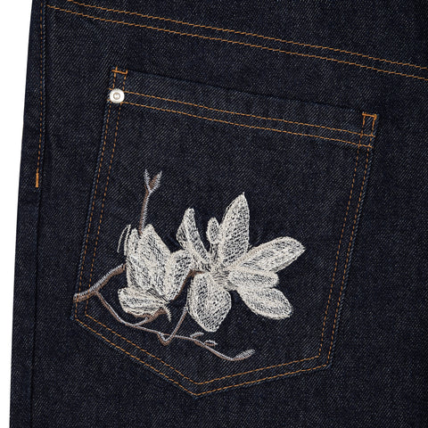 14,5oz raw denim / 100% cotton / yoke and back pocket look on front / embroideries on front pockets / plaid patterned deboss printed leather patch / custom button / baggy fit / fabric may bleed or fade, wash inside out in cold water to preserve color and character / fits true to size