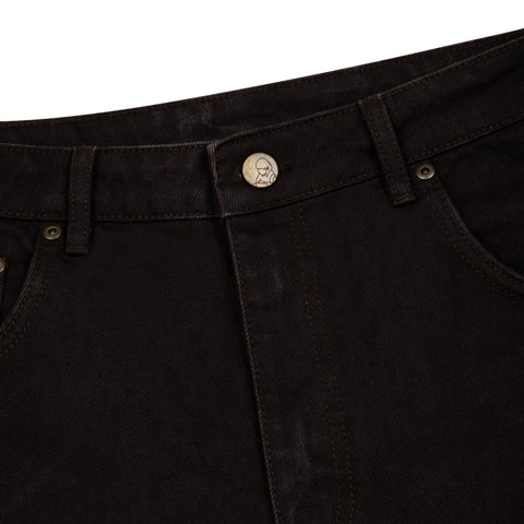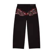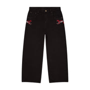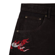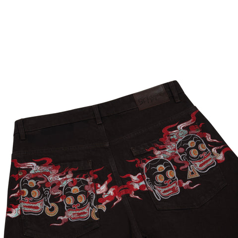 15oz denim / 100% cotton / embroidery on front and back / embroidered leather patch / wash inside out / balloon fit / fits true to size