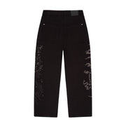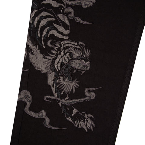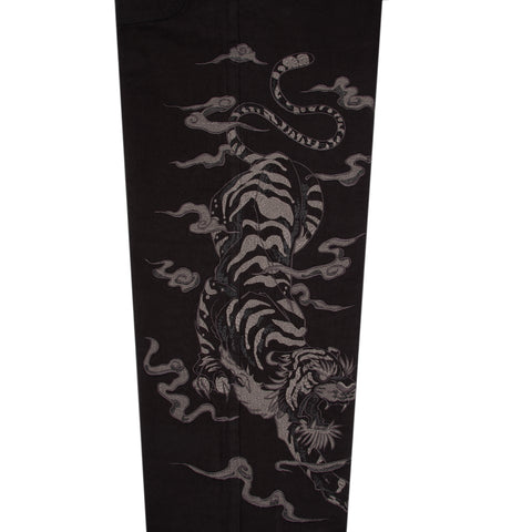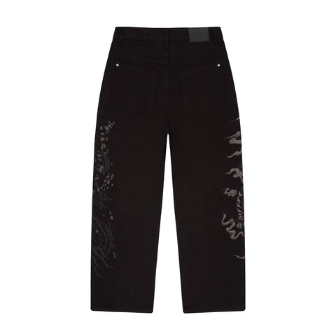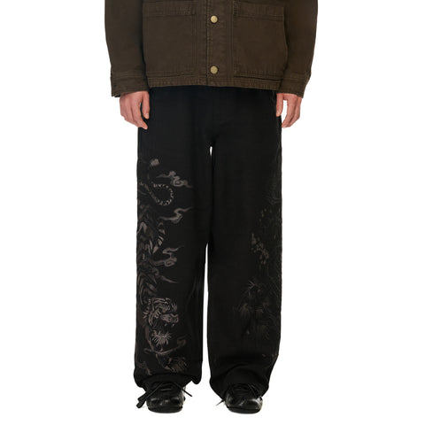 13oz jacquard patterned denim / 100% cotton / embroidery on front and back / debossed printed leather patch / wash inside out / straight fit / fits true to size