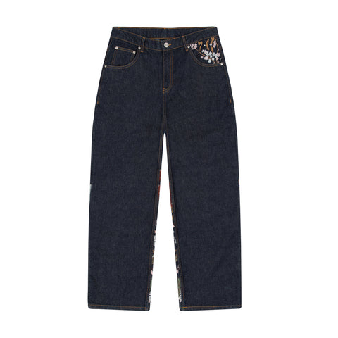 14oz raw denim / 100% cotton / embroidery on back / embroidered leather patch / wash inside out / balloon fit / fits true to size