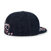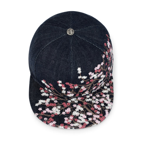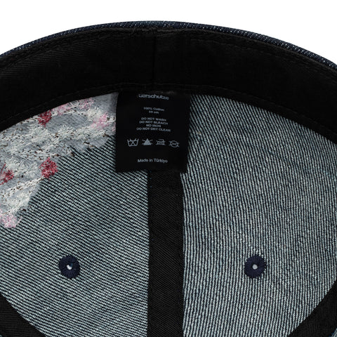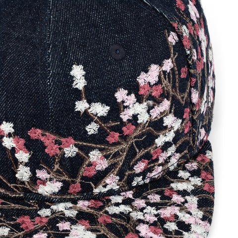 indigo raw denim / embroidery on front, back panels and visor / custom button on top