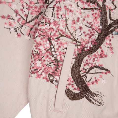 14oz pink washed denim / 100% cotton / embroidery on front and sleeve / with YKK zipper and fireman claps / quilted pattern lining and pocket inside / fits true to size