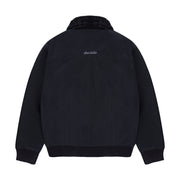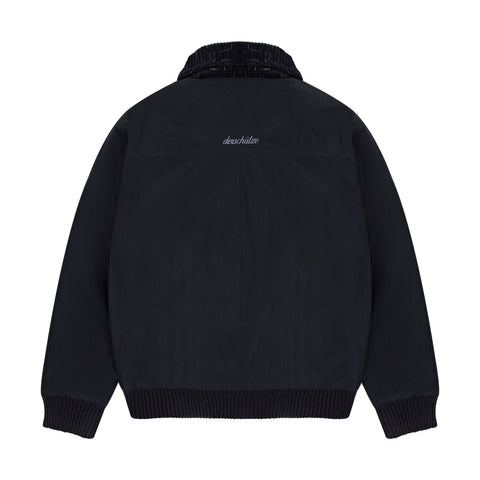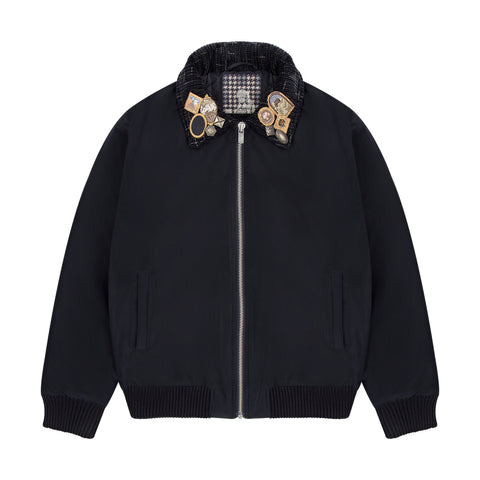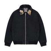 parachute fabric / fiber filling / collar from velvet fabric / ribbed hem and cuffs / embroidered collar with custom pins / embroidery on back / fits true to size