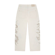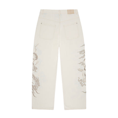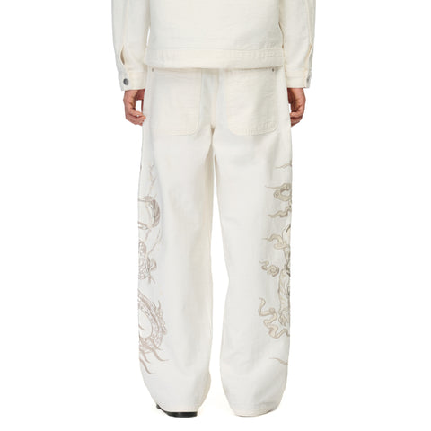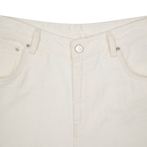 13oz jacquard patterned denim / 100% cotton / embroidery on front and back / debossed printed leather patch / wash inside out / straight fit / fits true to size