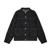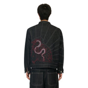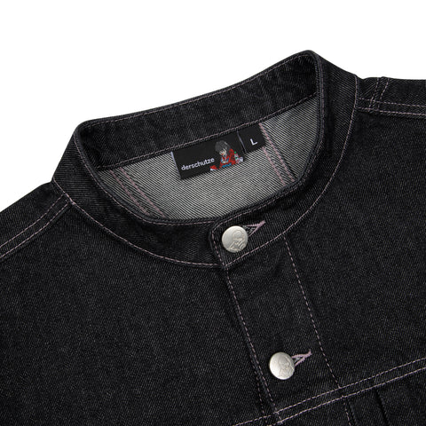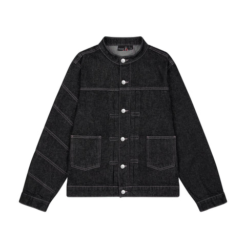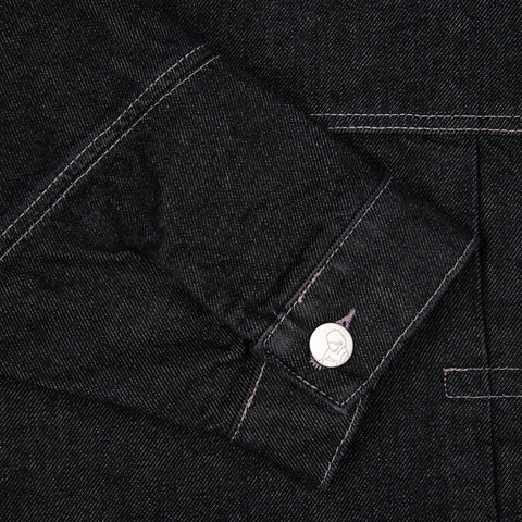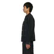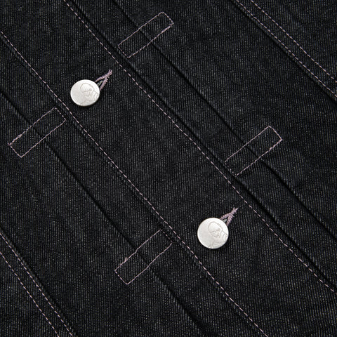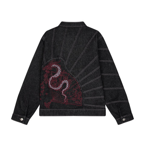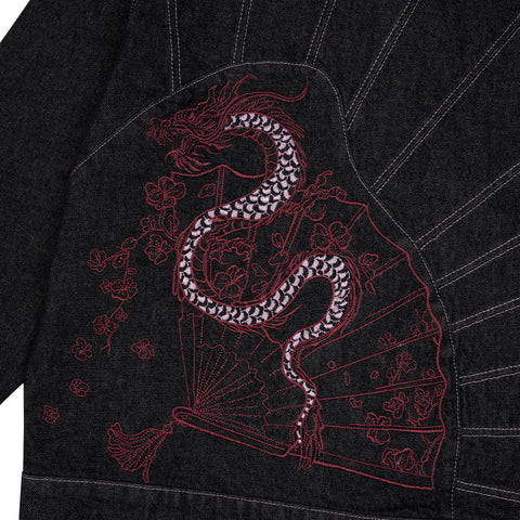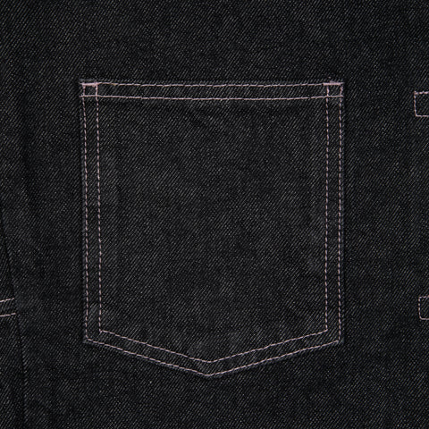 14,5oz raw denim / 100% cotton / fan-cut at back and right sleeve / embroidery on back / custom buttons / fits true to size